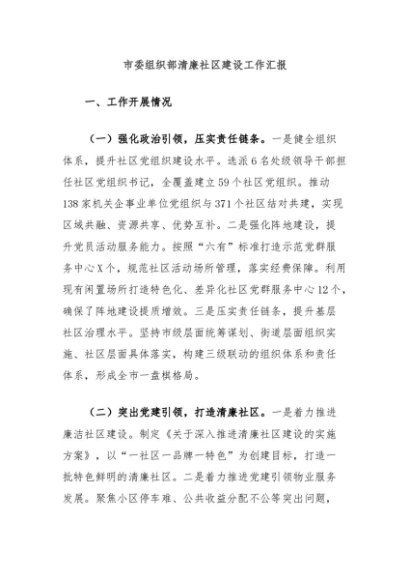 / 【七哥公文】2024年:市委组织部清廉社区建设工作汇报+更多免费公文+VX:QiGeGongWen2024