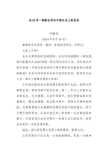 / 【七哥公文】2024年:在XX市一高新生军训开营仪式上的发言+更多免费公文+VX:QiGeGongWen2024