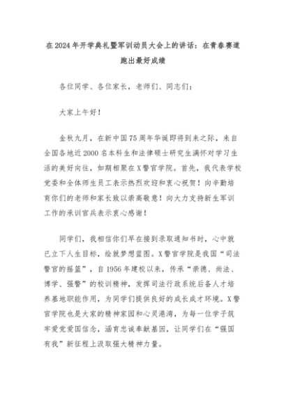 【七哥公文】2024年:在2024年开学典礼暨军训动员大会上的讲话:在青春赛道跑出最好成绩+更多免费公文+VX:QiGeGongWen2024