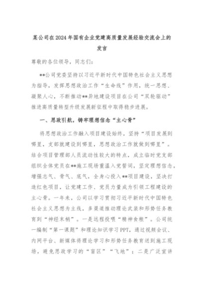 【七哥公文】2024年:某公司在2024年国有企业党建高质量发展经验交流会上的发言+更多免费公文+VX:QiGeGongWen2024