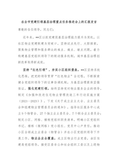 / 【七哥公文】2024年:在全市党建引领基层治理重点任务推进会上的汇报发言+更多免费公文+VX:QiGeGongWen2024