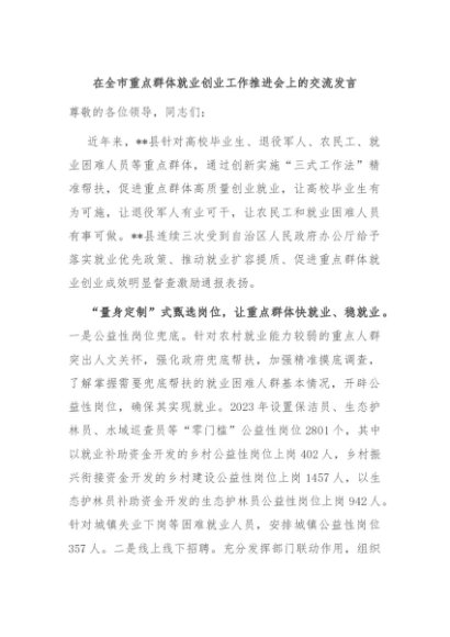 / 【七哥公文】2024年:在全市重点群体就业创业工作推进会上的交流发言+更多免费公文+VX:QiGeGongWen2024