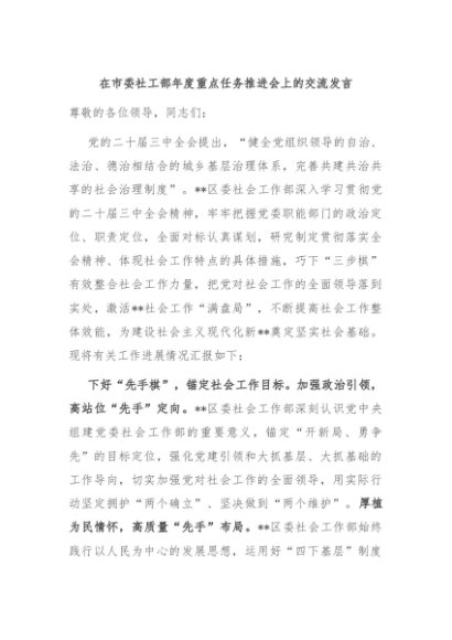 / 【七哥公文】2024年:在市委社工部年度重点任务推进会上的交流发言+更多免费公文+VX:QiGeGongWen2024