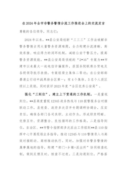 【七哥公文】2024年:在2024年全市非警务警情分流工作推进会上的交流发言+更多免费公文+VX:QiGeGongWen2024