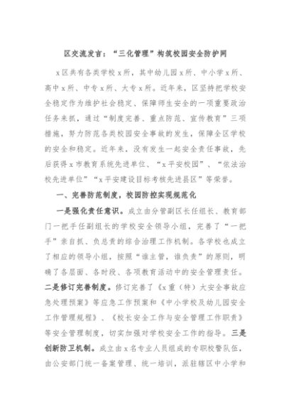 / 【七哥公文】2024年:区交流发言:“三化管理”构筑校园安全防护网+更多免费公文+VX:QiGeGongWen2024