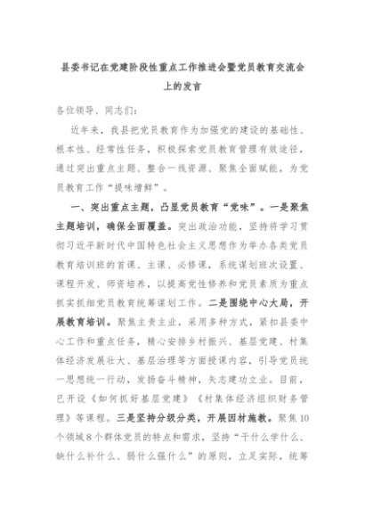 【七哥公文】2024年:县委书记在党建阶段性重点工作推进会暨党员教育交流会上的发言+更多免费公文+VX:QiGeGongWen2024