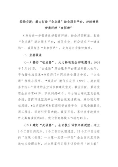 【七哥公文】2024年:经验交流:着力打造“企业通”助企服务平台,持续擦亮营商环境“金招牌”+更多免费公文+VX:QiGeGongWen2024