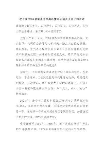 【七哥公文】2024年:校长在2024级新生开学典礼暨军训动员大会上的讲话+更多免费公文+VX:QiGeGongWen2024
