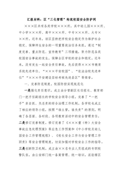 / 【七哥公文】2024年:汇报材料:区“三化管理”构筑校园安全防护网+更多免费公文+VX:QiGeGongWen2024