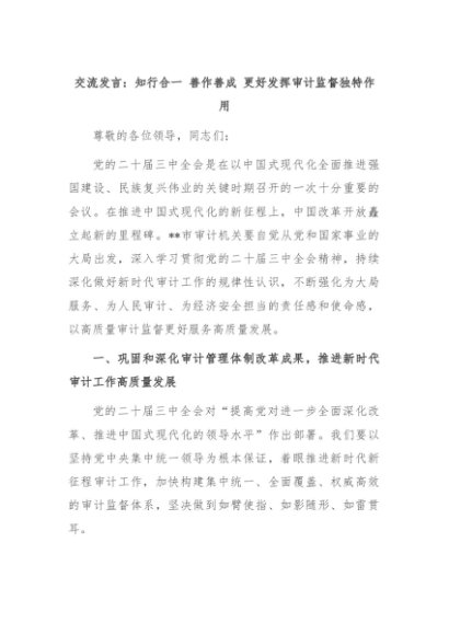 【七哥公文】2024年:交流发言:知行合一 善作善成 更好发挥审计监督独特作用+更多免费公文+VX:QiGeGongWen2024