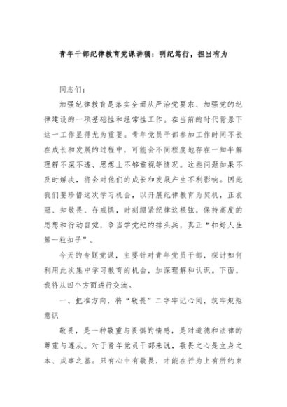 【七哥公文】2024年:青年干部纪律教育党课讲稿:明纪笃行,担当有为.+更多免费公文+VX:QiGeGongWen2024