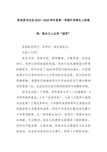 【七哥公文】2024年:校党委书记在2024-2025学年度第一学期开学典礼上的致辞:做自己人生的“冠军”+更多免费公文+VX:QiGeGongWen2024