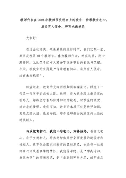 【七哥公文】2024年:教师代表在2024年教师节庆祝会上的发言:传承教育初心,肩负育人使命,培育未来栋梁+更多免费公文+VX:QiGeGongWen2024