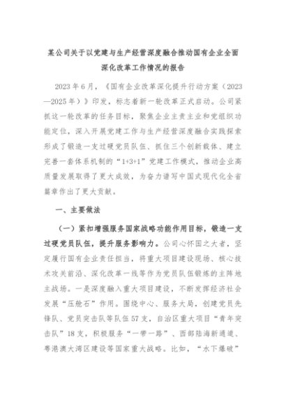 【七哥公文】2024年:某公司关于以党建与生产经营深度融合推动国有企业全面深化改革工作情况的报告+更多免费公文+VX:QiGeGongWen2024