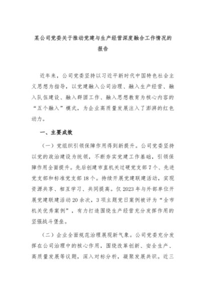 【七哥公文】2024年:某公司党委关于推动党建与生产经营深度融合工作情况的报告+更多免费公文+VX:QiGeGongWen2024