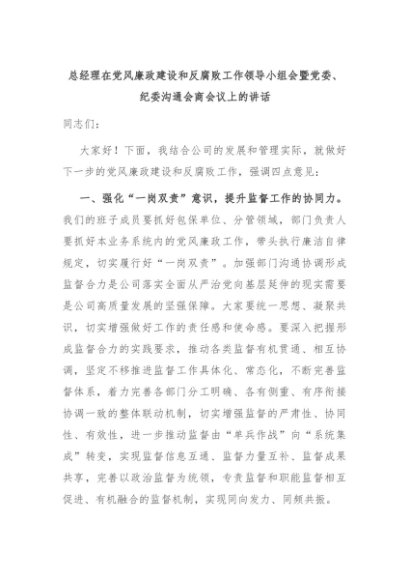 【七哥公文】2024年:总经理在党风廉政建设和反腐败工作领导小组会暨党委、纪委沟通会商会议上的讲话+更多免费公文+VX:QiGeGongWen2024