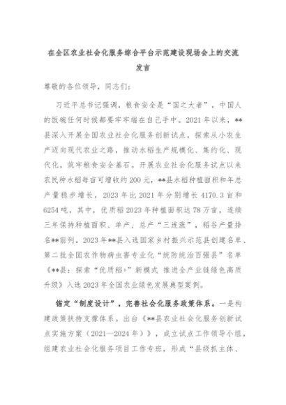 【七哥公文】2024年:在全区农业社会化服务综合平台示范建设现场会上的交流发言+更多免费公文+VX:QiGeGongWen2024