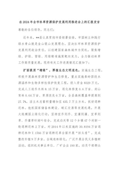 【七哥公文】2024年:在2024年全市林草资源保护发展利用推进会上的汇报发言+更多免费公文+VX:QiGeGongWen2024