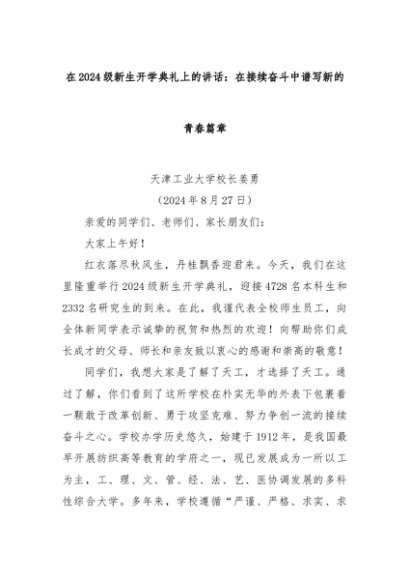 【七哥公文】2024年:在2024级新生开学典礼上的讲话:在接续奋斗中谱写新的青春篇章+更多免费公文+VX:QiGeGongWen2024