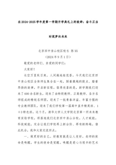 【七哥公文】2024年:在2024-2025学年度第一学期开学典礼上的致辞:奋斗正当时筑梦向未来+更多免费公文+VX:QiGeGongWen2024