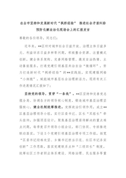 【七哥公文】2024年:在全市坚持和发展新时代“枫桥经验” 推进社会矛盾纠纷预防化解法治化现场会上的汇报发言+更多免费公文+VX:QiGeGongWen2024