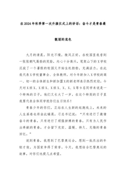 【七哥公文】2024年:在2024年秋季第一次升旗仪式上的讲话:奋斗才是青春最靓丽的底色+更多免费公文+VX:QiGeGongWen2024