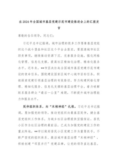 【七哥公文】2024年:在2024年全国城市基层党建示范市建设推进会上的汇报发言+更多免费公文+VX:QiGeGongWen2024