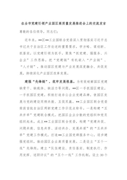【七哥公文】2024年:在全市党建引领产业园区高质量发展推进会上的交流发言+更多免费公文+VX:QiGeGongWen2024