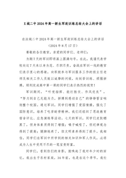 【七哥公文】2024年:X城二中2024年高一新生军政训练总结大会上的讲话+更多免费公文+VX:QiGeGongWen2024