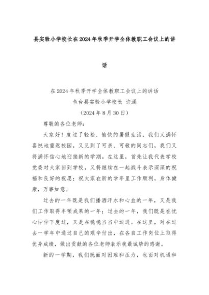 【七哥公文】2024年:县实验小学校长在2024年秋季开学全体教职工会议上的讲话+更多免费公文+VX:QiGeGongWen2024