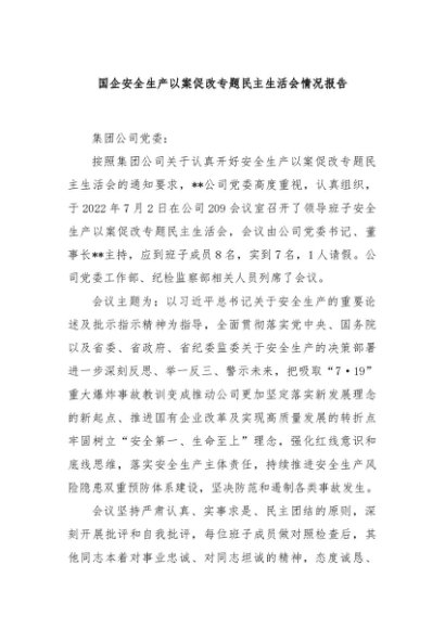 / 【七哥公文】2024年:国企安全生产以案促改专题民主生活会情况报告+更多免费公文+VX:QiGeGongWen2024