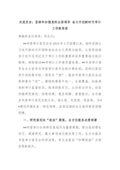 【七哥公文】2024年:交流发言:坚持和加强党的全面领导 奋力开创新时代审计工作新局面+更多免费公文+VX:QiGeGongWen2024