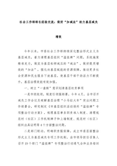 【七哥公文】2024年:社会工作部部长经验交流:做好“加减法”助力基层减负增效+更多免费公文+VX:QiGeGongWen2024
