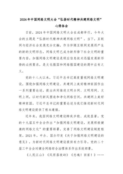 【七哥公文】2024年:2024年中国网络文明大会“弘扬时代精神共建网络文明”心得体会+更多免费公文+VX:QiGeGongWen2024