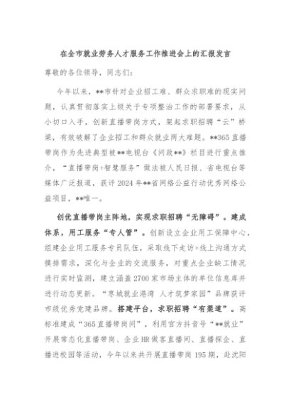 / 【七哥公文】2024年:在全市就业劳务人才服务工作推进会上的汇报发言+更多免费公文+VX:QiGeGongWen2024
