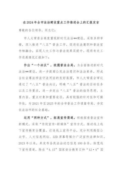 【七哥公文】2024年:在2024年全市法治建设重点工作推进会上的汇报发言+更多免费公文+VX:QiGeGongWen2024