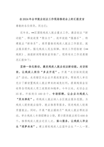 【七哥公文】2024年:在2024年全市就业创业工作现场推进会上的汇报发言+更多免费公文+VX:QiGeGongWen2024