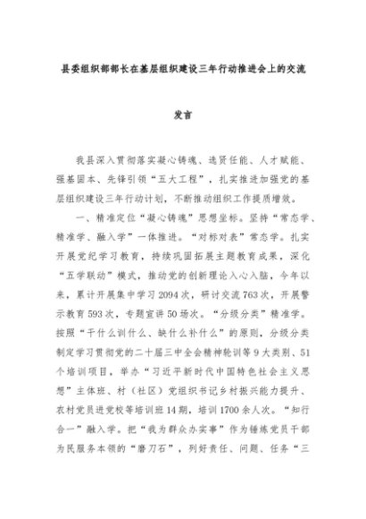 【七哥公文】2024年:县委组织部部长在基层组织建设三年行动推进会上的交流发言+更多免费公文+VX:QiGeGongWen2024