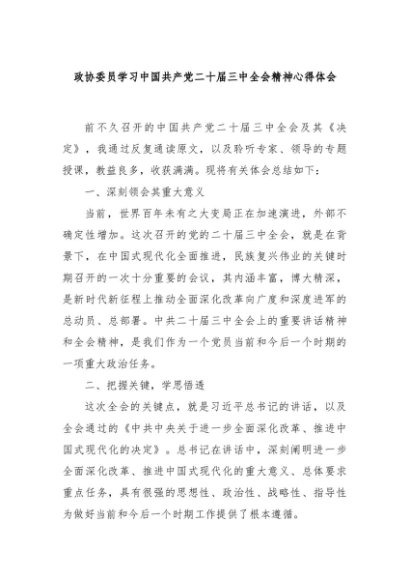 【七哥公文】2024年:政协委员学习中国共产党二十届三中全会精神心得体会+更多免费公文+VX:QiGeGongWen2024