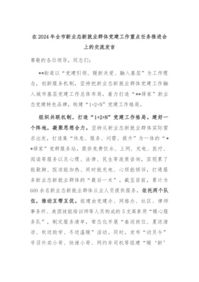 【七哥公文】2024年:在2024年全市新业态新就业群体党建工作重点任务推进会上的交流发言+更多免费公文+VX:QiGeGongWen2024