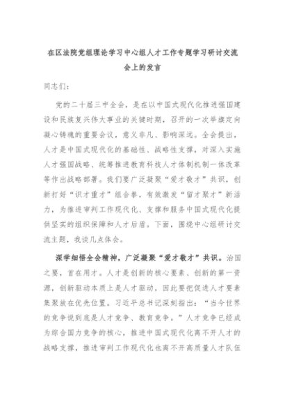 【七哥公文】2024年:在区法院党组理论学习中心组人才工作专题学习研讨交流会上的发言+更多免费公文+VX:QiGeGongWen2024
