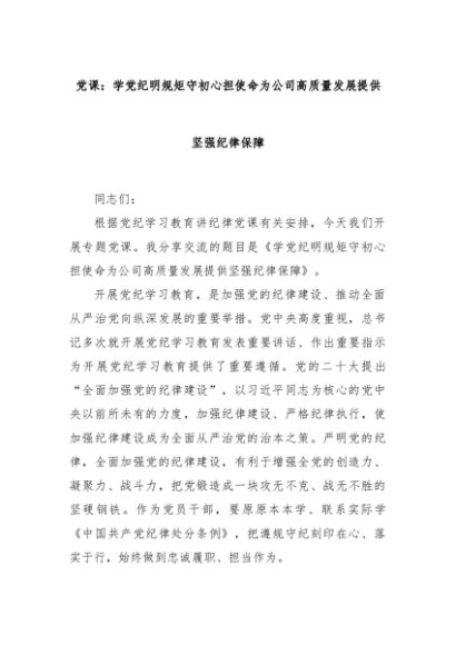 【七哥公文】2024年:党课:学党纪明规矩守初心担使命为公司高质量发展提供坚强纪律保障+更多免费公文+VX:QiGeGongWen2024
