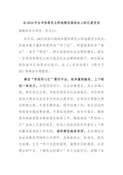 【七哥公文】2024年:在2024年全市协商民主阵地建设推进会上的汇报发言+更多免费公文+VX:QiGeGongWen2024