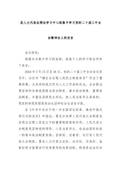 【七哥公文】2024年:县人大代表在理论学习中心组集中学习党的二十届三中全会精神会上的发言+更多免费公文+VX:QiGeGongWen2024