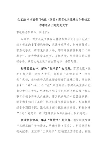 【七哥公文】2024年:在2024年市直部门党组(党委)落实机关党建主体责任工作推进会上的交流发言+更多免费公文+VX:QiGeGongWen2024