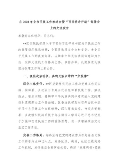 【七哥公文】2024年:在2024年全市民族工作推进会暨“百日提升行动”部署会上的交流发言+更多免费公文+VX:QiGeGongWen2024