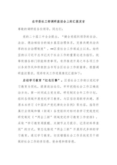 / 【七哥公文】2024年:在市委社工部调研座谈会上的汇报发言+更多免费公文+VX:QiGeGongWen2024