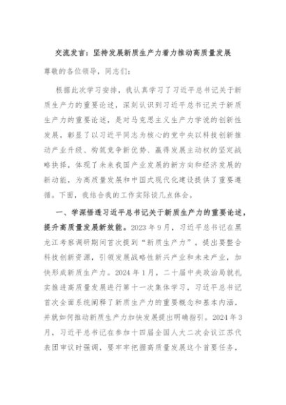/ 【七哥公文】2024年:交流发言:坚持发展新质生产力着力推动高质量发展+更多免费公文+VX:QiGeGongWen2024