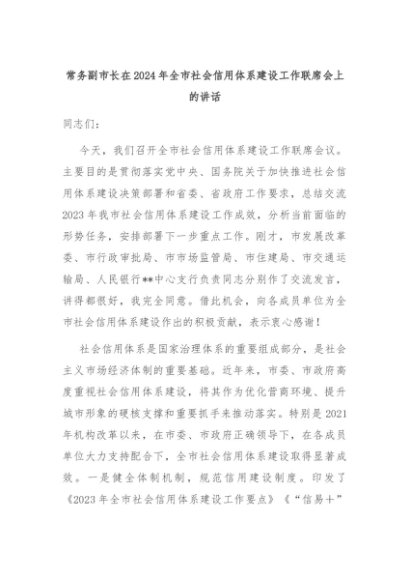 【七哥公文】2024年:常务副市长在2024年全市社会信用体系建设工作联席会上的讲话+更多免费公文+VX:QiGeGongWen2024