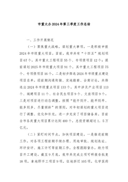 / 【七哥公文】2024年:市重大办2024年第三季度工作总结+更多免费公文+VX:QiGeGongWen2024